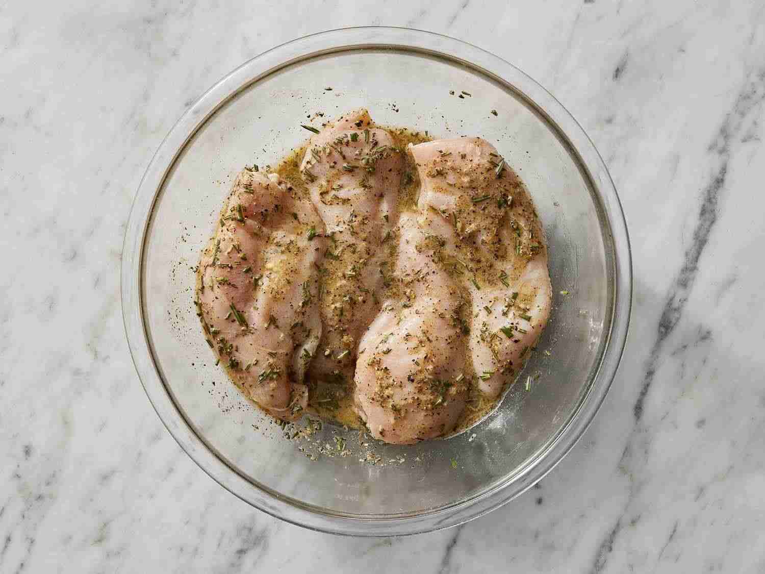 Add chicken breasts to bowl with lemon juice mixture and toss to coat completely, using your hands to gently massage lemon juice mixture into each chicken breast. Cover bowl with plastic wrap and refrigerate for 1 hour. Dotdash Meredith Food Studios